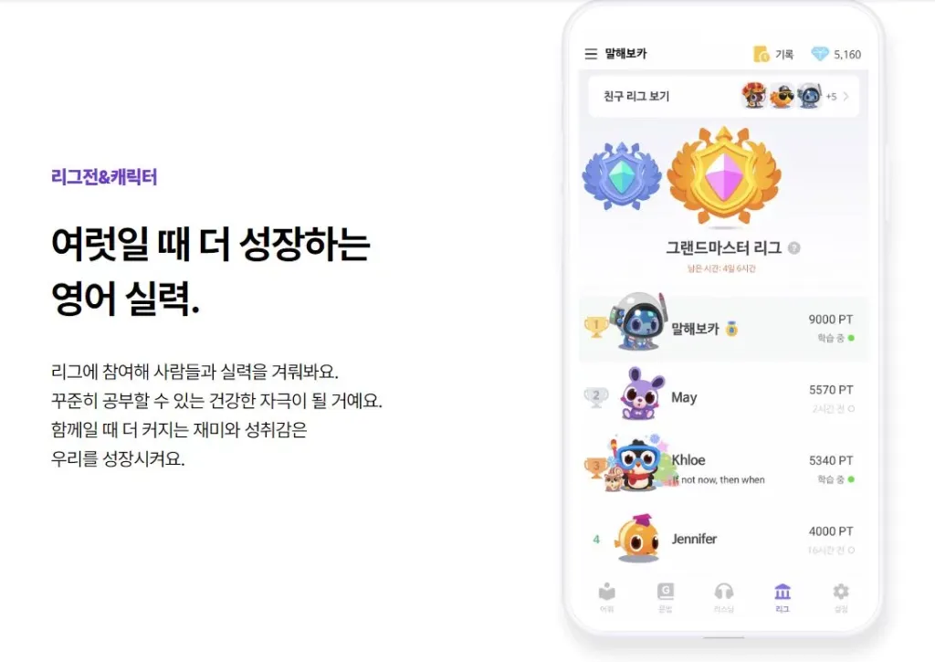 세계적인 언어 교육 어플 듀오링고와 마찬가지로 캐릭터가 있어서 영어공부를 해가며 육성해가는 원리인데 리그에 들어가면 순위가 떨어지지 않으려고 자동적으로 열심히 하게되어 꾸준히 공부하는 습관을 형성하게된다는 장점이 있습니다.
