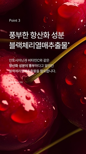 블랙체리에는 안토시아닌과 비타민C 같은 항산화 성분이 포함되어 있어 피부의 건강과 활력을 돕고, 피부장벽을 강화합니다.